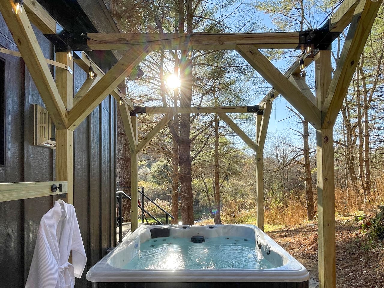 Welcome to Laurel Valley Retreat! Come enjoy 64 acres, surrounding this Scandi inspired cabin! Soak in your private hot tub, shower outdoors under the stars, and enjoy the fresh air as you hike up the mountainside or sit peacefully near the rushing creek. Toast marshmallows and spoil yourself with s'mores around the firepit. The cozy space is full of natural light and warmth with comfy furnishings inside and out. Less than 5 miles from Hatley Pointe Ski Resort (Wolf Ridge).