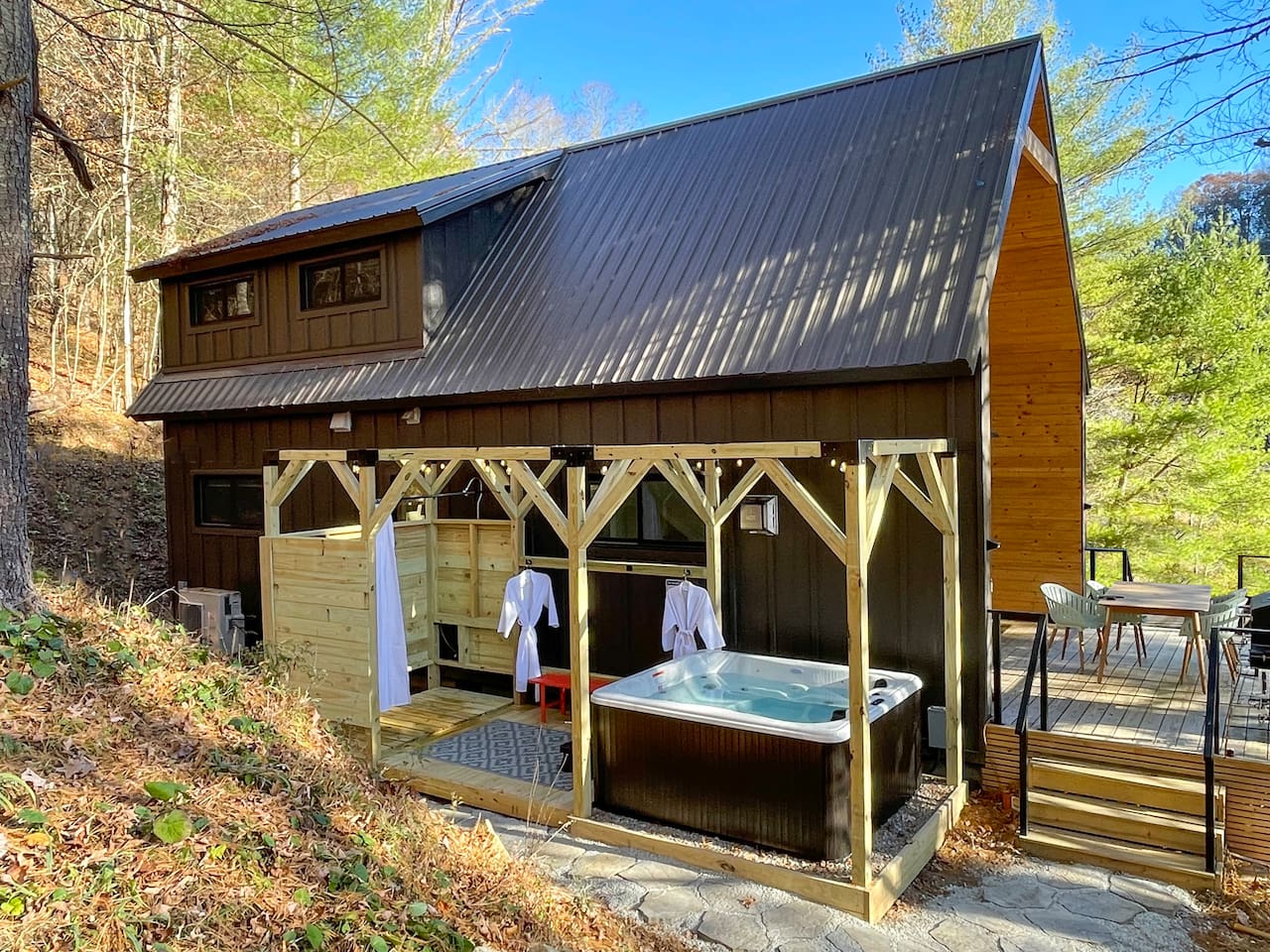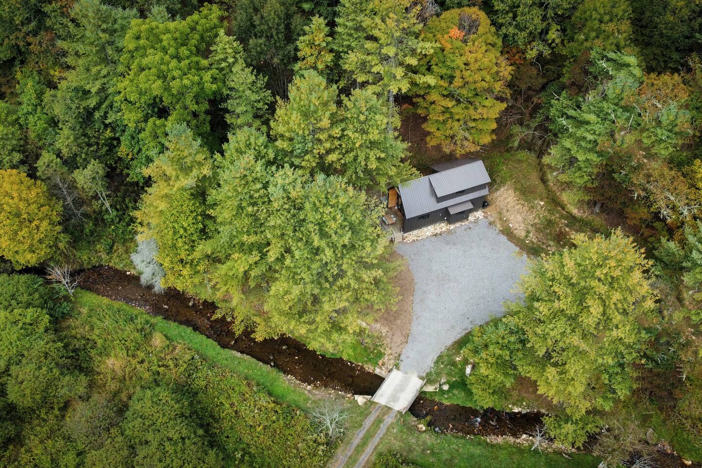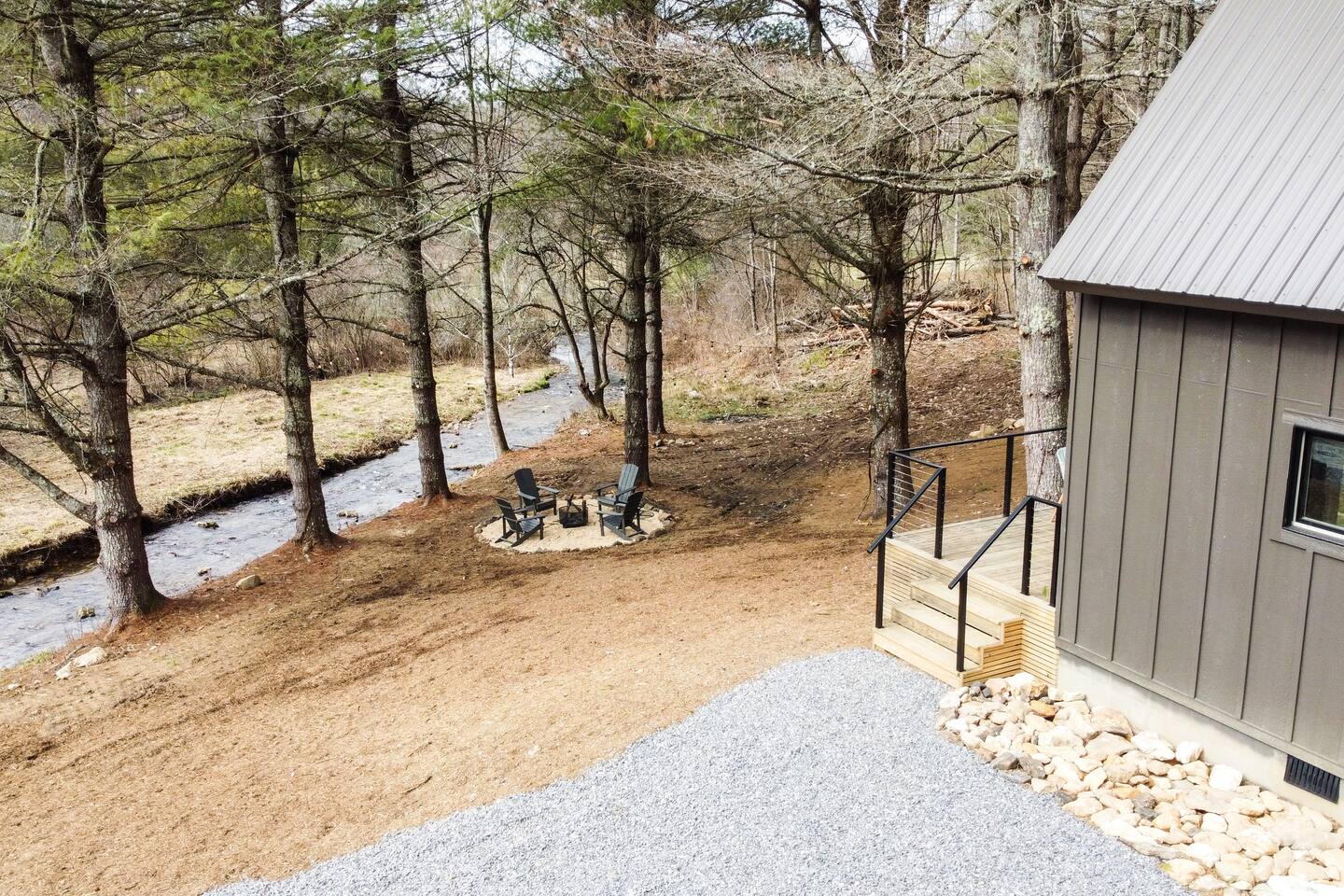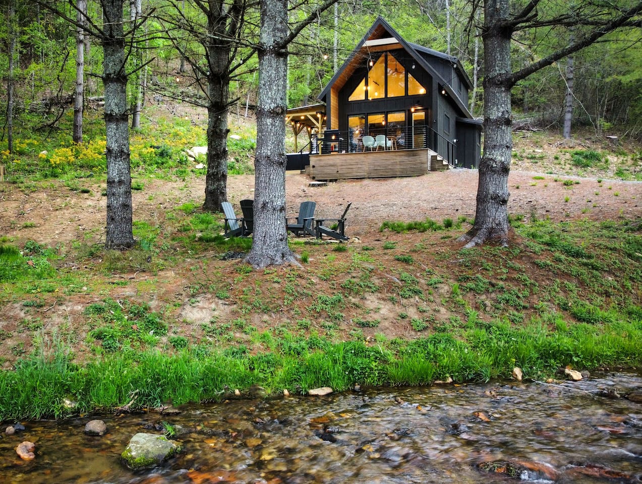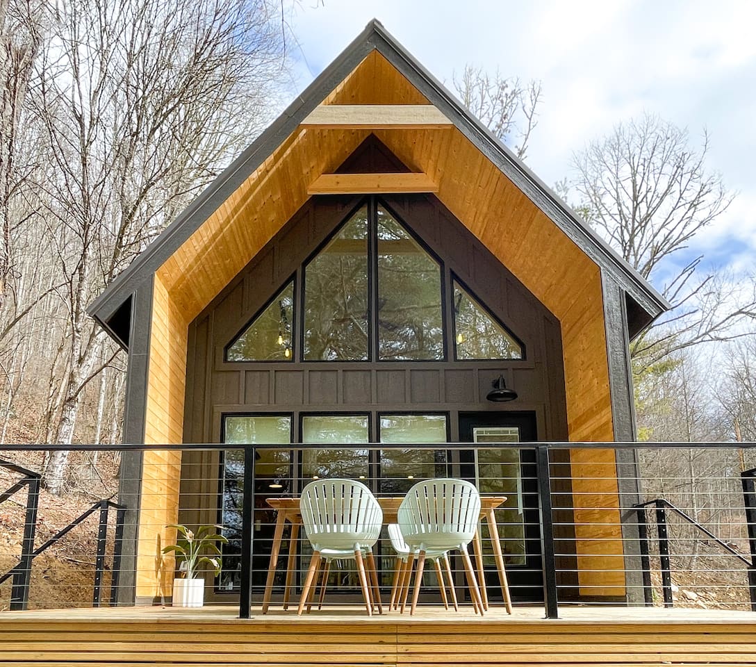 The cabin is the perfect blend of "tiny" yet spacious. Tall ceilings, big windows, and just the right amount of space for maximum comfort and relaxation. The living room and kitchen are open to one another to keep everyone connected. Grab a coffee or tea from the dining nook next to the kitchen. Bench seating and chairs allow for plenty of seating around the table. Your first bedroom is downstairs at the back of the house with a queen bed. Right outside the door is the first full bath with walk in shower. Make your way upstairs to the second bedroom also with a queen bed. The full bathroom is attached with a tub and shower combination. There is a dedicated work desk if you're mixing business with pleasure. Since you've come to Western North Carolina to enjoy the great outdoors you won't find a better place! Kick back on the large deck with dining table that overlooks the bold creek and fire pit just below the cabin. Soak in your private hot tub or enjoy the outdoor shower among the tree canopy. But wait, there's more! 64 acres of private land is yours to explore! Old logging roads throughout the land provide a great route to the top of the mountain. Look for the deer who call this land their home and enjoy the quiet privacy this slice of heaven has to offer.
