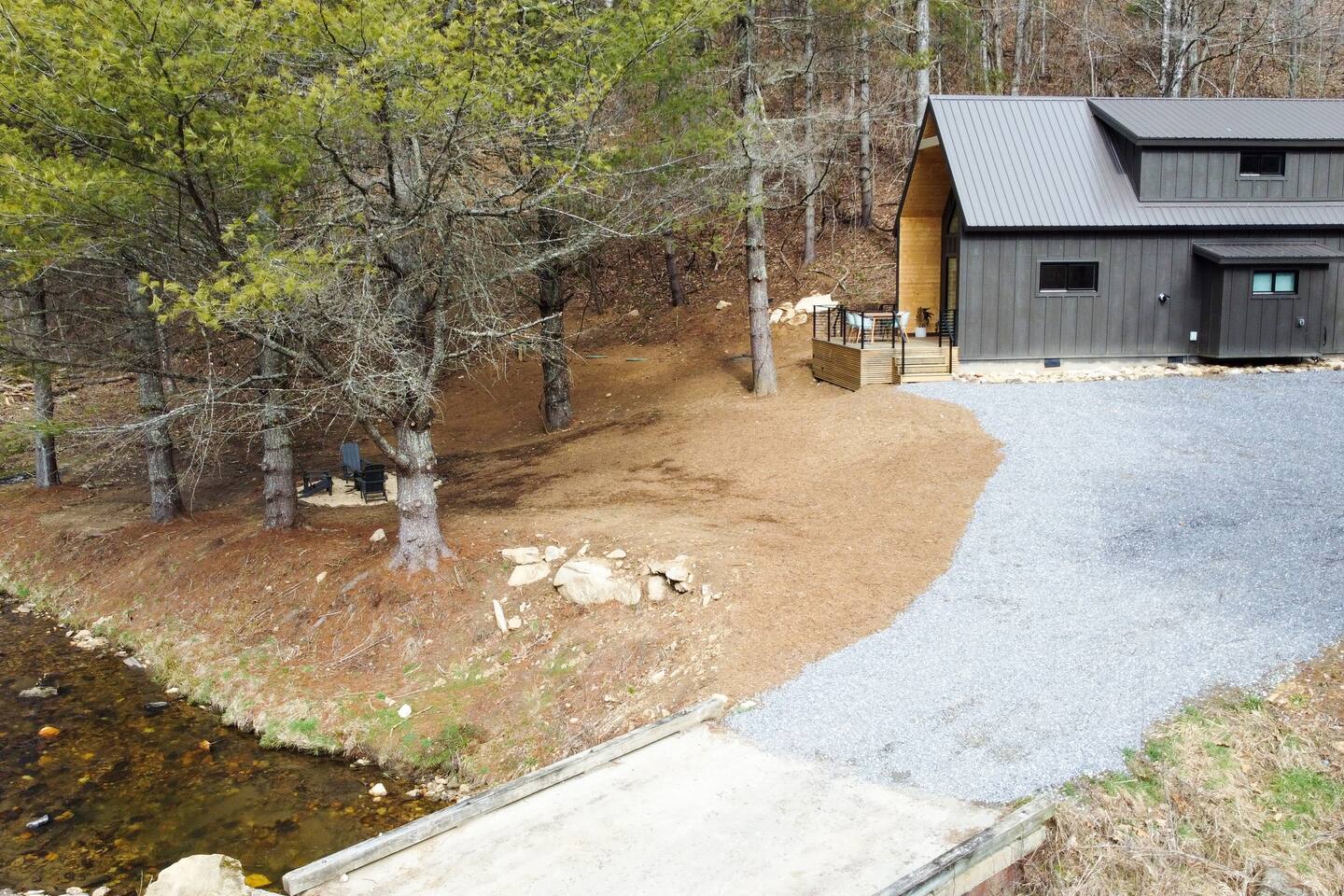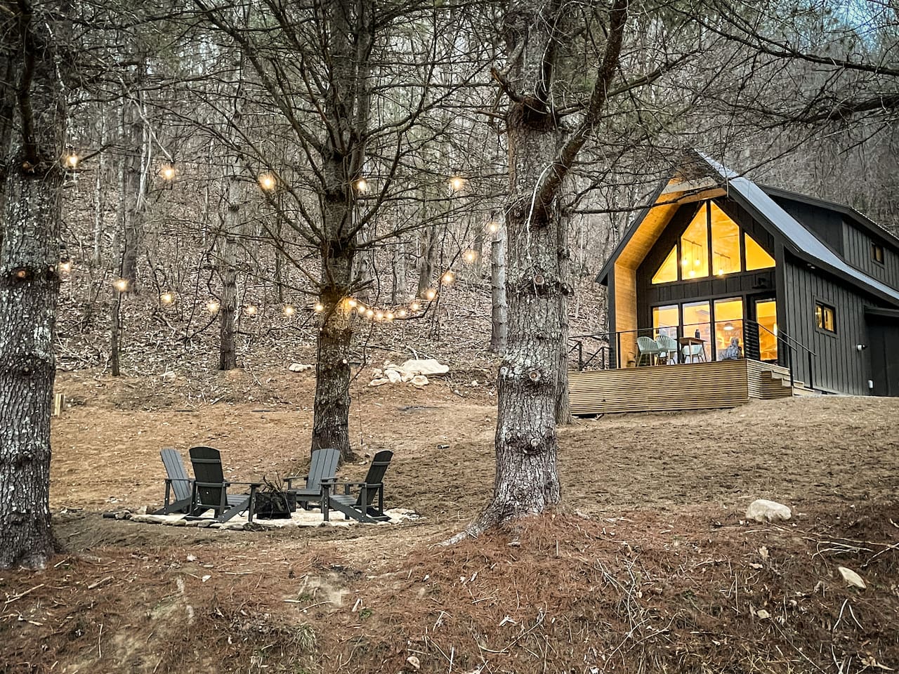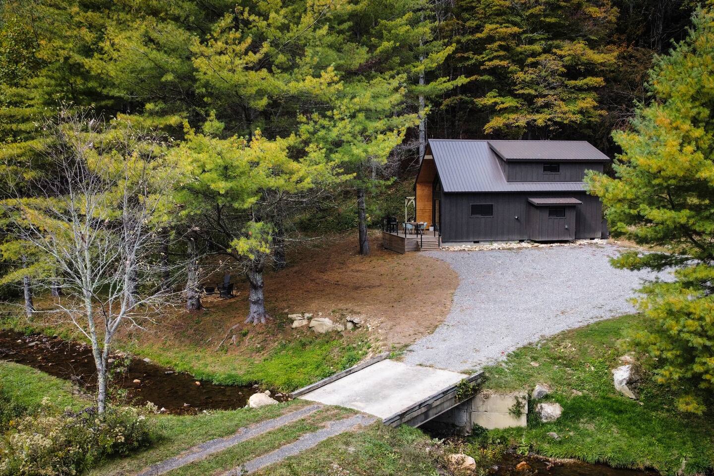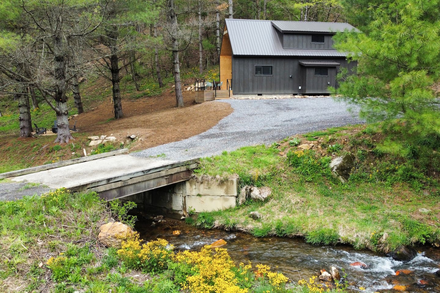 The cabin is the perfect blend of "tiny" yet spacious. Tall ceilings, big windows, and just the right amount of space for maximum comfort and relaxation. The living room and kitchen are open to one another to keep everyone connected. Grab a coffee or tea from the dining nook next to the kitchen. Bench seating and chairs allow for plenty of seating around the table. Your first bedroom is downstairs at the back of the house with a queen bed. Right outside the door is the first full bath with walk in shower. Make your way upstairs to the second bedroom also with a queen bed. The full bathroom is attached with a tub and shower combination. There is a dedicated work desk if you're mixing business with pleasure. Since you've come to Western North Carolina to enjoy the great outdoors you won't find a better place! Kick back on the large deck with dining table that overlooks the bold creek and fire pit just below the cabin. Soak in your private hot tub or enjoy the outdoor shower among the tree canopy. But wait, there's more! 64 acres of private land is yours to explore! Old logging roads throughout the land provide a great route to the top of the mountain. Look for the deer who call this land their home and enjoy the quiet privacy this slice of heaven has to offer.