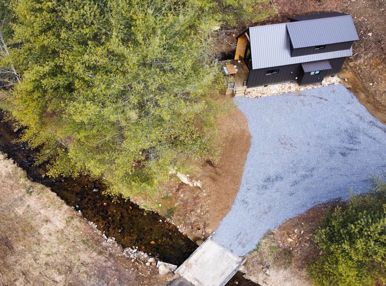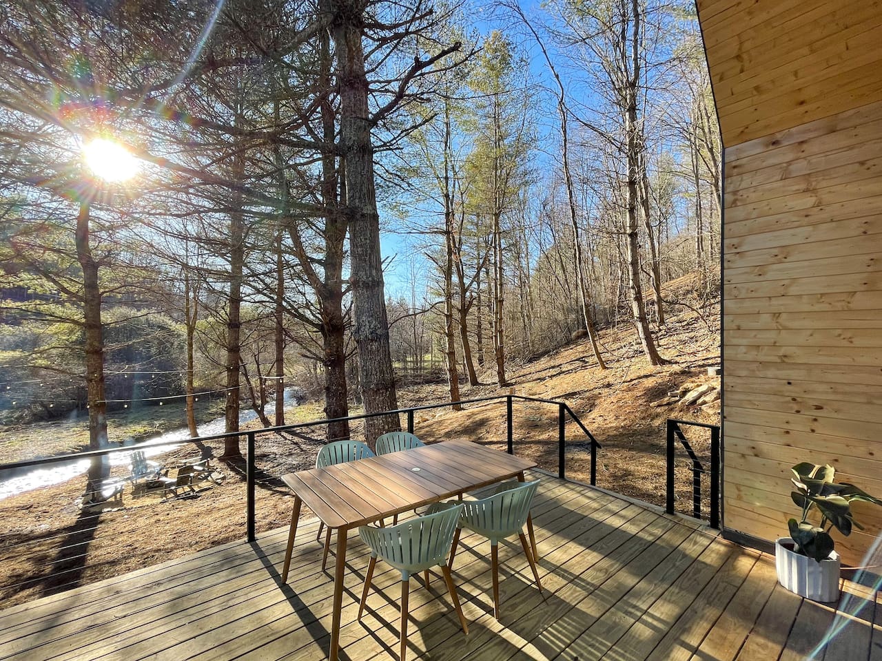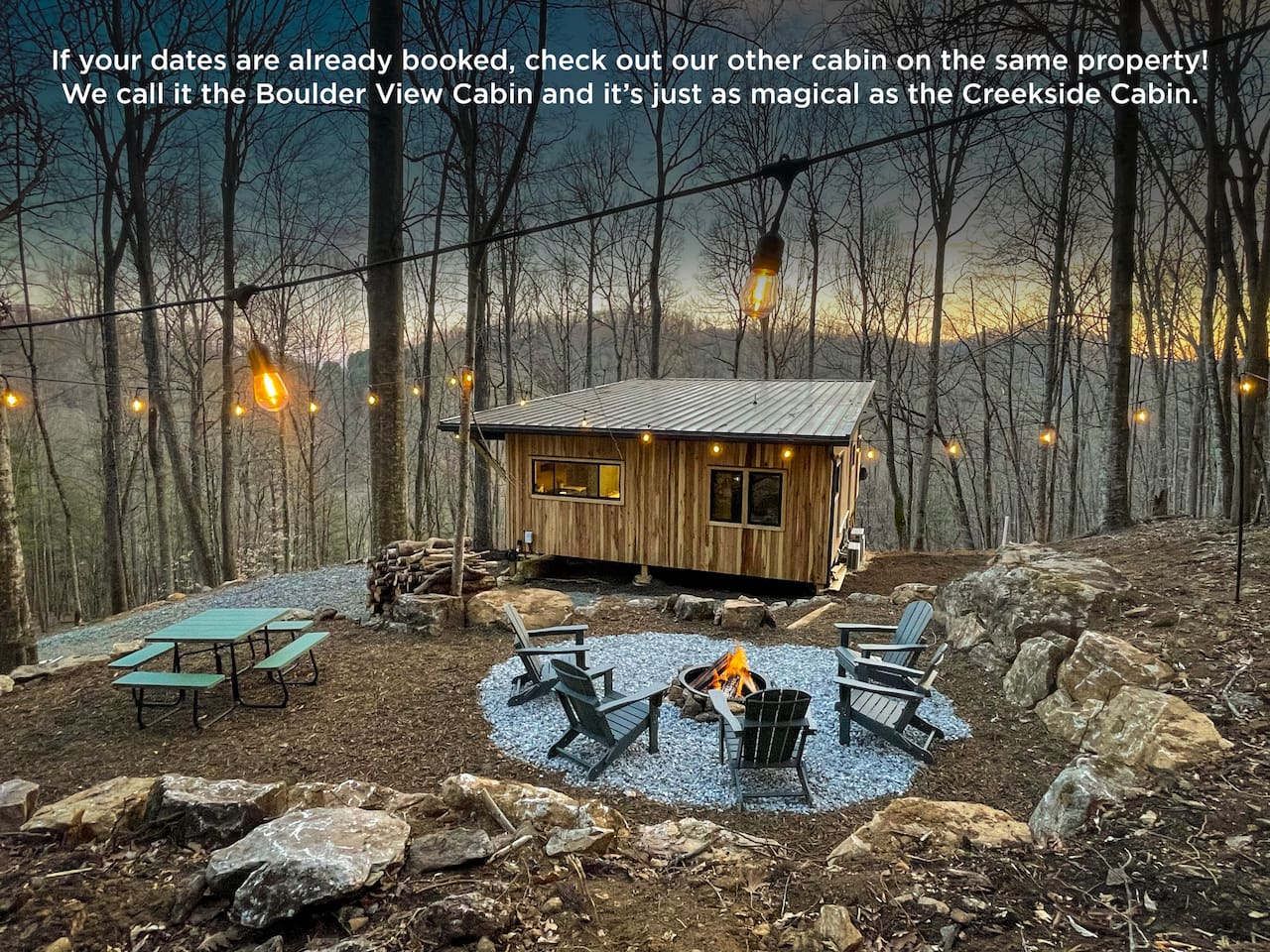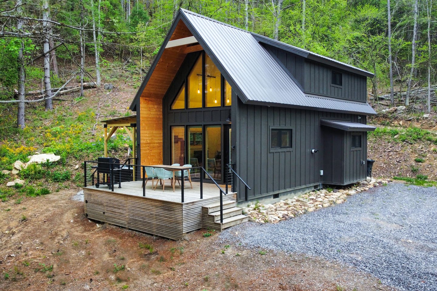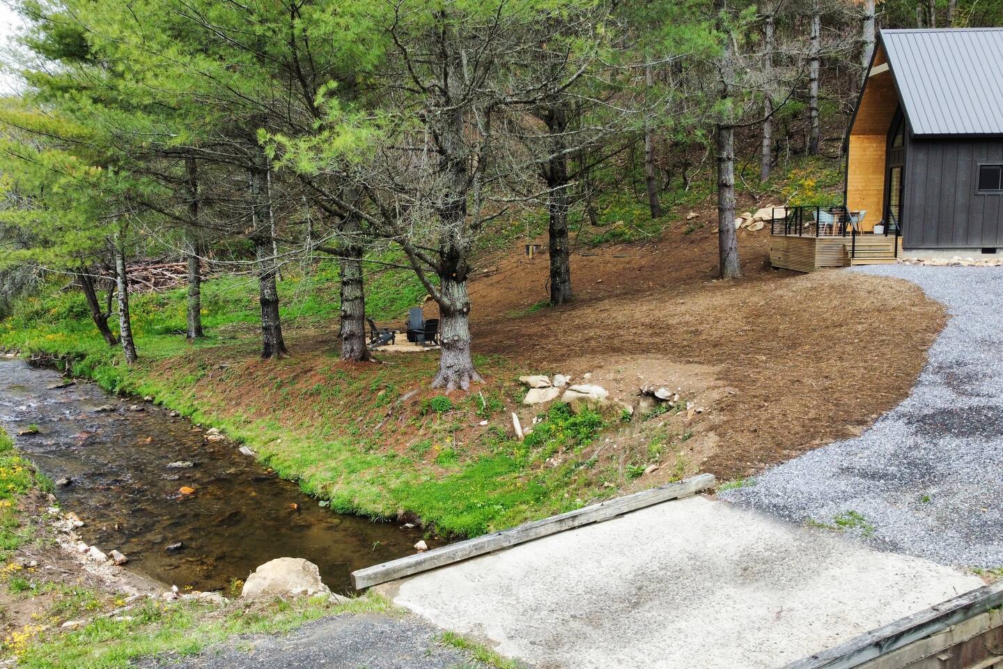 The cabin is the perfect blend of "tiny" yet spacious. Tall ceilings, big windows, and just the right amount of space for maximum comfort and relaxation. The living room and kitchen are open to one another to keep everyone connected. Grab a coffee or tea from the dining nook next to the kitchen. Bench seating and chairs allow for plenty of seating around the table. Your first bedroom is downstairs at the back of the house with a queen bed. Right outside the door is the first full bath with walk in shower. Make your way upstairs to the second bedroom also with a queen bed. The full bathroom is attached with a tub and shower combination. There is a dedicated work desk if you're mixing business with pleasure. Since you've come to Western North Carolina to enjoy the great outdoors you won't find a better place! Kick back on the large deck with dining table that overlooks the bold creek and fire pit just below the cabin. Soak in your private hot tub or enjoy the outdoor shower among the tree canopy. But wait, there's more! 64 acres of private land is yours to explore! Old logging roads throughout the land provide a great route to the top of the mountain. Look for the deer who call this land their home and enjoy the quiet privacy this slice of heaven has to offer.